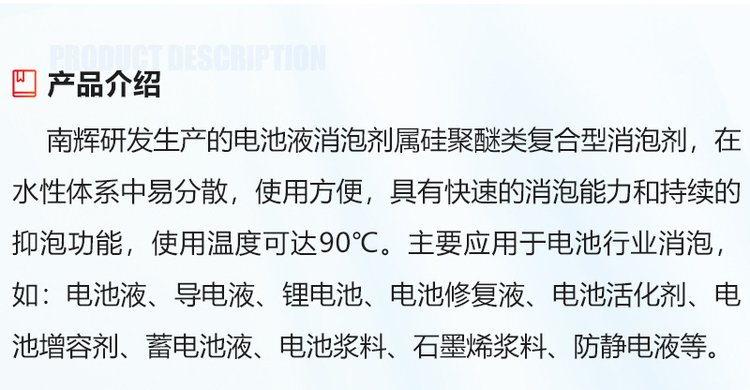 应用 | 电池补充液消泡剂 电池电解液消泡剂 电池活化剂消泡剂 电池浆料消泡剂 电池硫酸消泡剂 电池修复液消泡 |