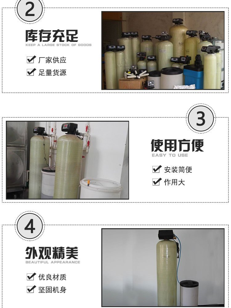 水的硬度主要是由其中的阳离子:钙(Ca2+)、镁(Mg2+)离子构成的。当含有硬度离子的原水通过交换器树脂层时,水中的钙、镁离子与树脂内的钠离子发生置换,树脂吸附了钙、镁离子而钠离子进入水中,这样从交换器内流出的水就是去掉了硬度离子的软化水。随着交换过程的不断进行,树脂中Na+全部被置出来后就失去了交换功能,此时必须使用Nacl溶液对树脂进行再生,将树脂吸附的Ca2+、Mg2+置换下来,树脂重新吸附了钠离子,恢复了软化交换能力。