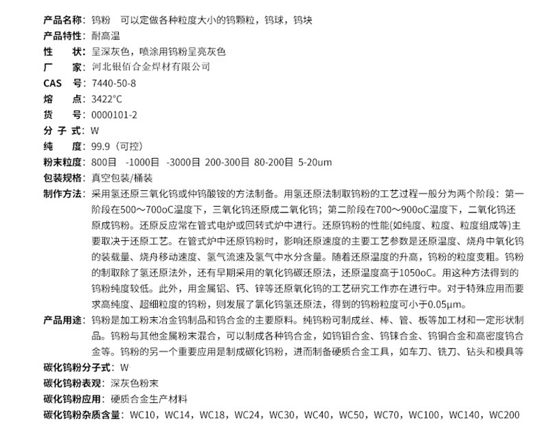高纯钨粉 W粉 粉末冶金铸造用金属钨 200目 银佰