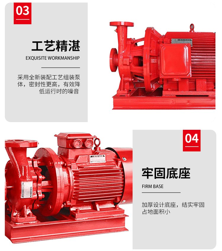 1、消防泵结构紧凑、体积小、外形美观,其立式结构决定安装占地面积小,其重心合于泵脚中心,因而增强了泵的运行稳定性和使用寿命。