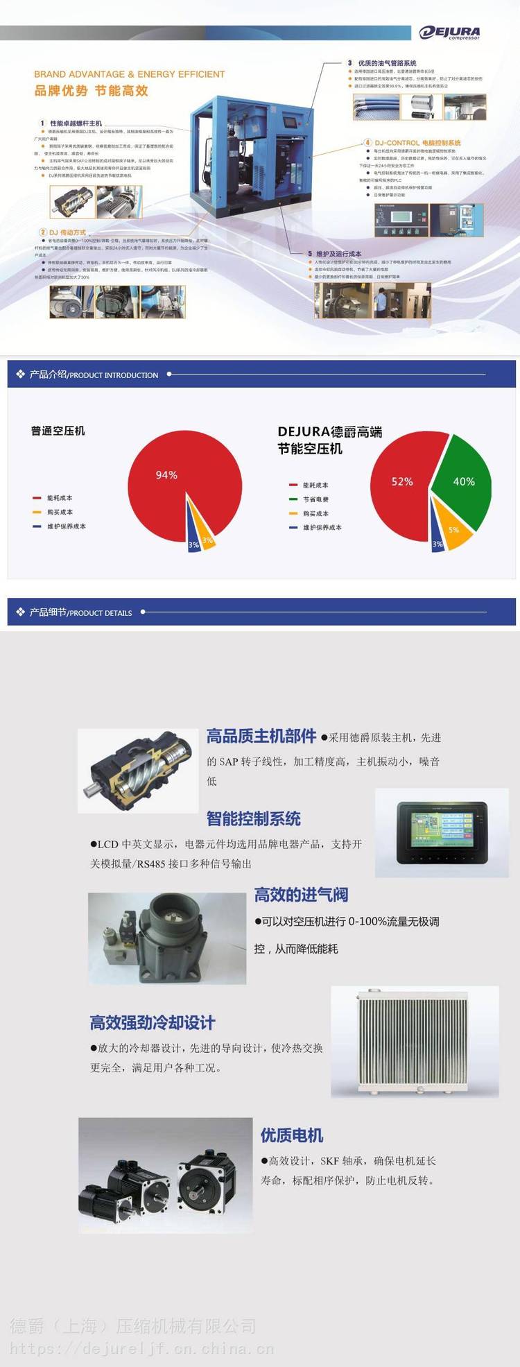 DEJURA德爵系列螺杆空压拥有ISO9001质量认证,并拥有国家一级能效,可比2、3级能效节能省电40%以上,德爵系列螺杆空压机搭载德国德爵原装主机,效率更高,运行时间更长,噪音低,寿命长,品质有保障!