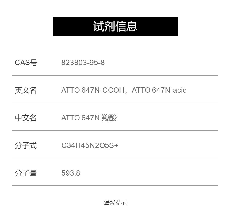 红色光谱区荧光标签ATTO 647N-COOH(CAS号:823803-95-8),具有强吸收、高荧光量子产率、高光稳定性和良好的水溶性。