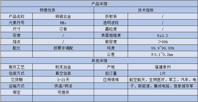 磁控溅射镀膜钨钼合金靶材 WMo 实验科研钼钨合金靶 钼 钨靶选做