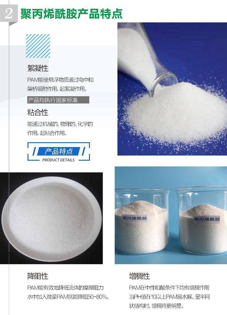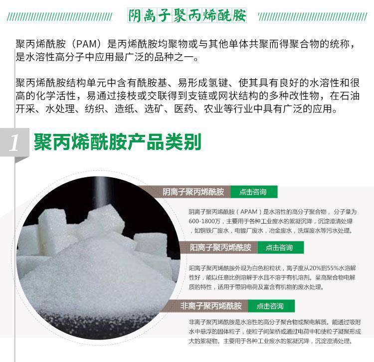 聚丙烯酰胺分类聚丙烯酰胺产品简介:聚丙烯酰胺(PAM)为水溶性高分子聚合物,不溶于大多数有机溶剂,具有良好的絮凝性,可以降低液体之间的磨擦阻力,按离子特性分可分为非离子、阴离子、阳离子和两性型四种类型。聚丙烯酰胺产品详情: PAM为水溶性高分子聚合物,不溶于大多数有机溶剂,具有良好的絮絮凝性,可以降低液体之间的磨擦阻力,按离子特性分可分为非离子、阴离子、阳离子和两性型四种类型。