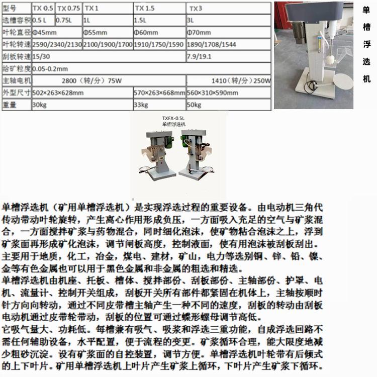 单槽浮选机(矿用单槽浮选机)由电动机三角带传动,带动叶轮旋转,产生离心作用形成负压,一方面吸入充足的空气与矿浆混合,一方面搅拌矿浆与药物混合,同时细化泡沫,使矿物粘合泡沫之上,浮到矿浆面再形成矿化泡沫。调节闸板高度,控制液面,使有用泡沫被刮板刮出。