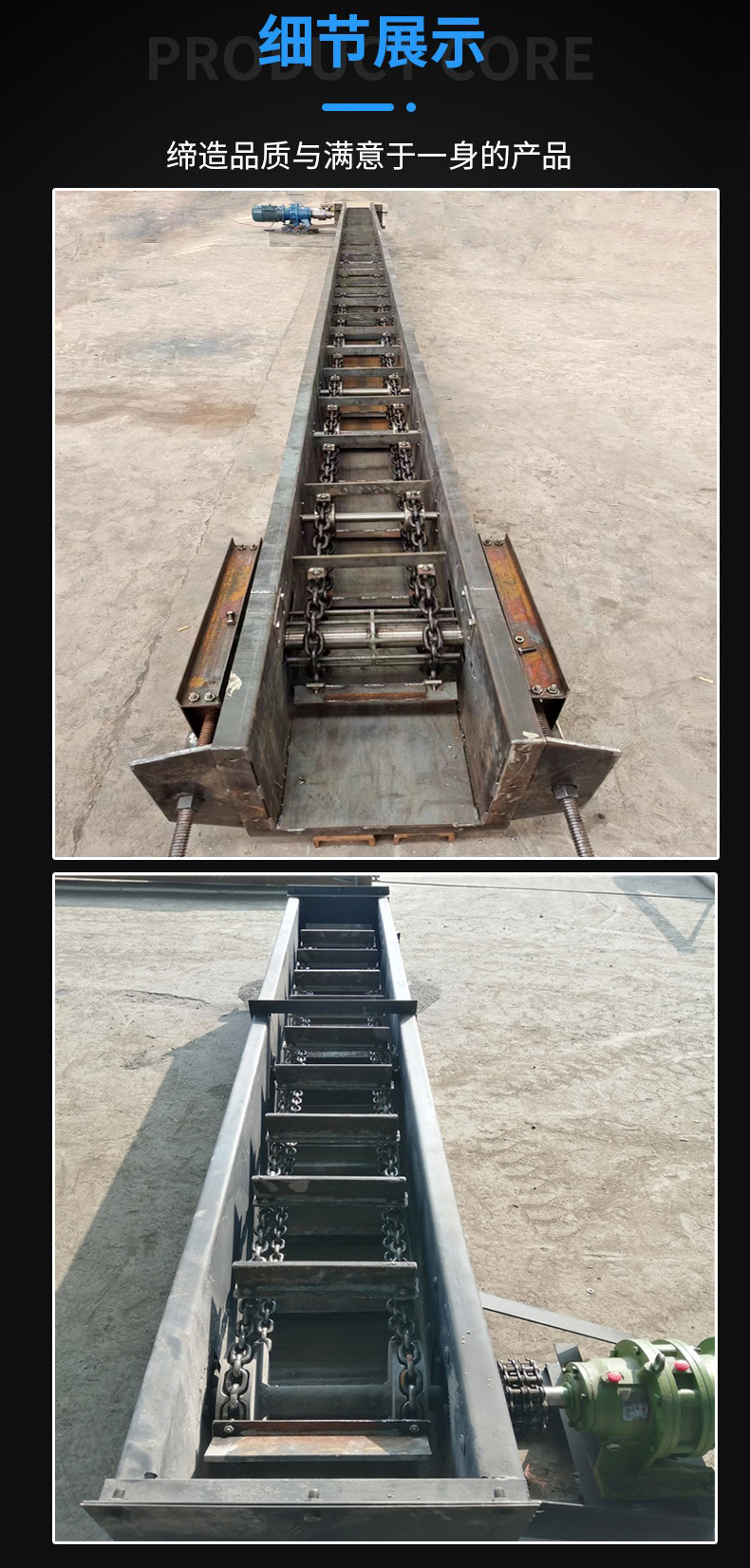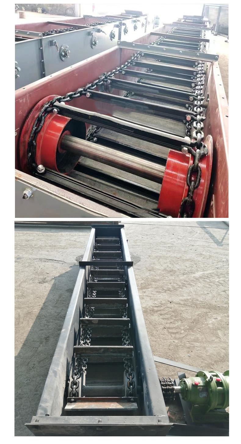 当机头传动部启动后,带动机头轴上的链轮旋转,使刮板链循环运行带动物料沿着溜槽移动,直至到机头部卸载