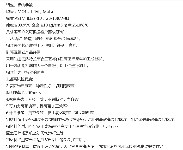 工艺 | 烧结-锻造--旋锻-拉拔-磨光-钼丝成品。 |