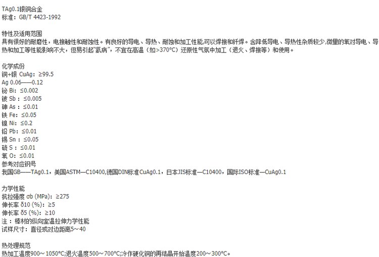 供应高导电TAg0.1银铜合金 进口TAg0.1银铜棒 TAg0.1银铜板
