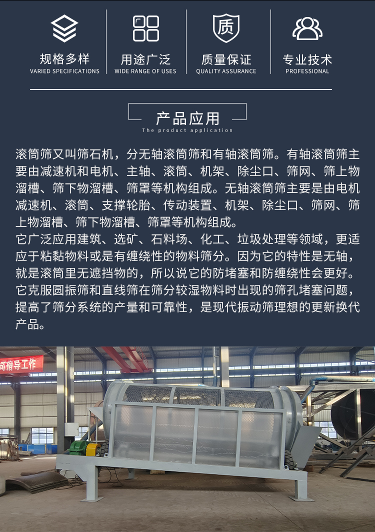 用途 | 建筑、选矿、石料场,石块和土块或石子的筛分和分选、化工、饲料、垃圾处理 |