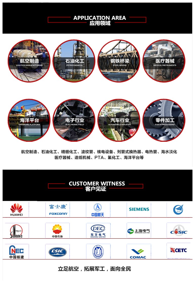 用途范围 | 航空航天、军工装备、船舶制造、石油化工、机械加工、能源光电、仪表等 |