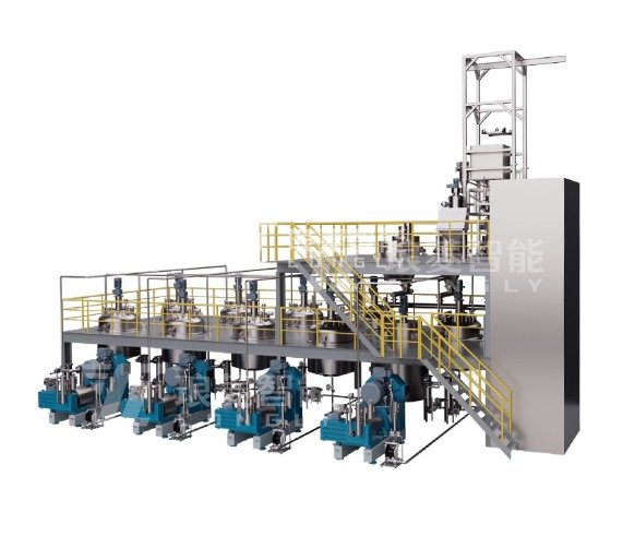 ①吨包投料站 ②货梯 ③粗磨砂磨机 ④精磨砂磨机 ⑤预混罐 ⑥研磨罐