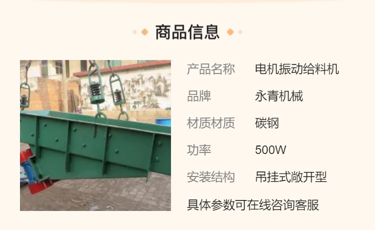 本系列振动给料机振动电机安装方式可分为下振式和侧振式;槽体分为敞开式和封闭式;减振系统由弹簧和支承座等组成,减振器安装方式可分为座式和吊挂式。还可以根据用户需要进行设计制造。