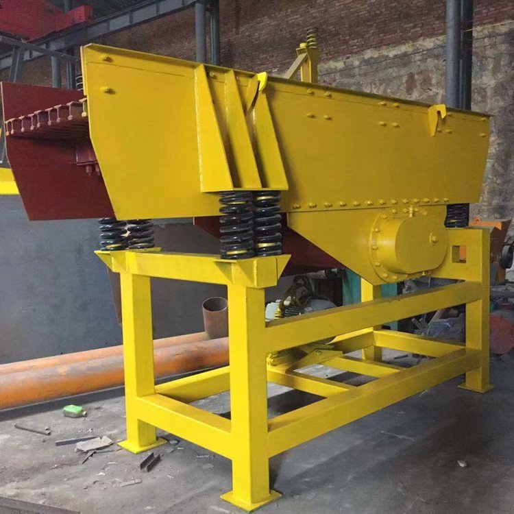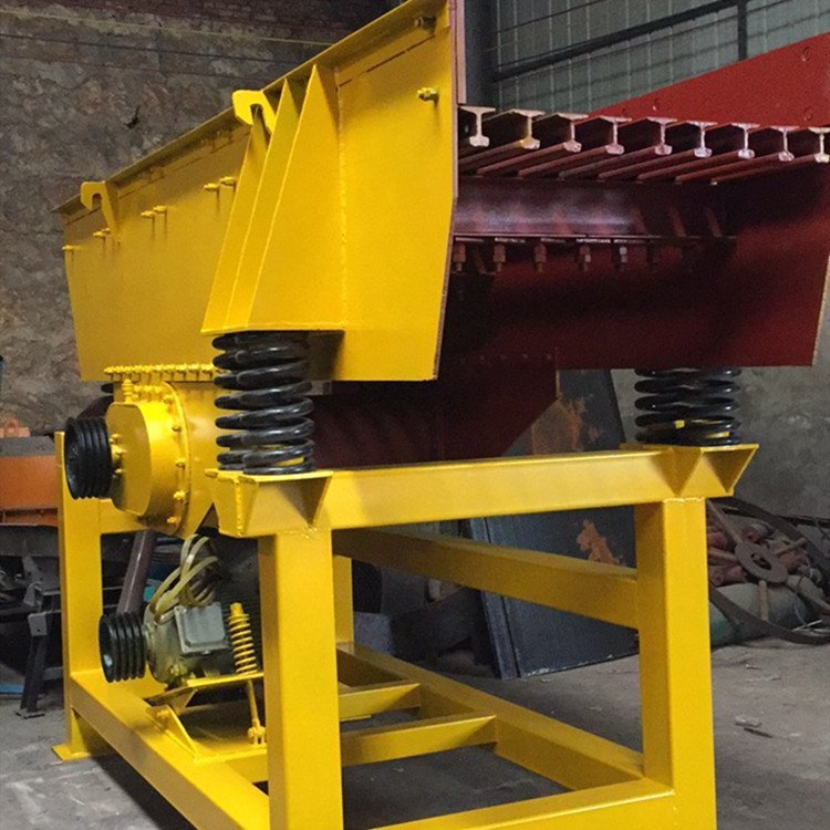 4、结构简单紧凑,体积小,重量轻,便于安装调试。 振动给料机是由给料槽体、激振器、弹簧支座、传动装置等组成。电动机通过三角带驱动主动轴,再由主动轴上齿轮啮合被动轴转动,主、被动轴同时反向旋转,使槽体振动,使物料连续不断流动,达到输送物料的目的。
