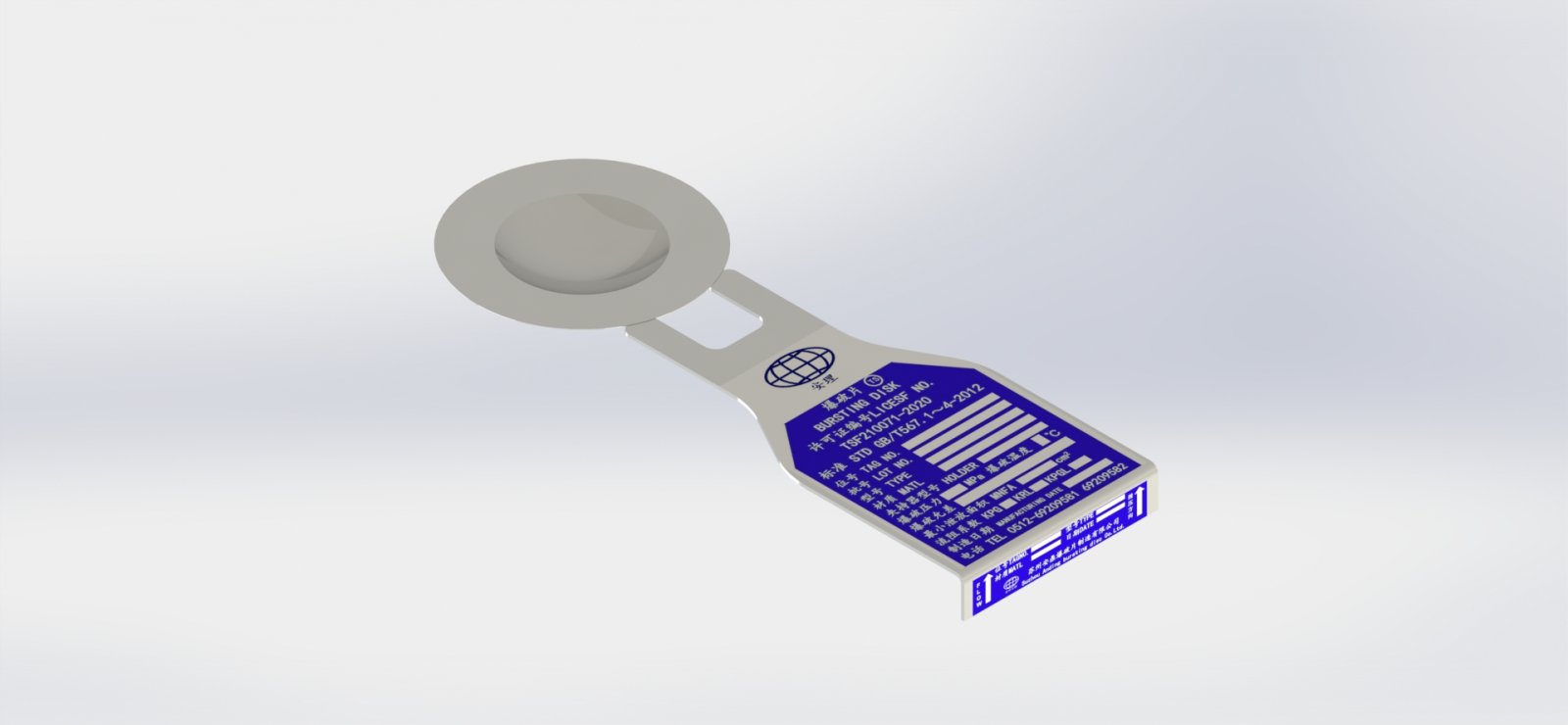 爆破片为单层膜片,凸面处于受压侧,超压时,爆破片失稳翻转,被上夹持器内的刀架刺破,泄放压力,保护容器安全。