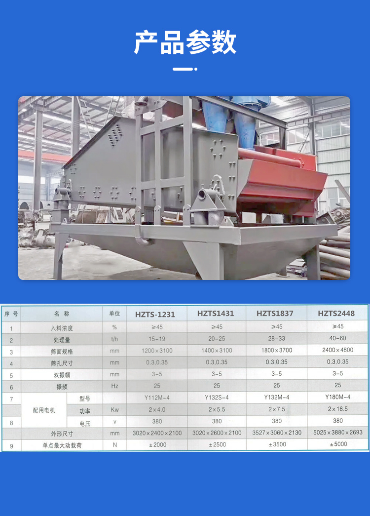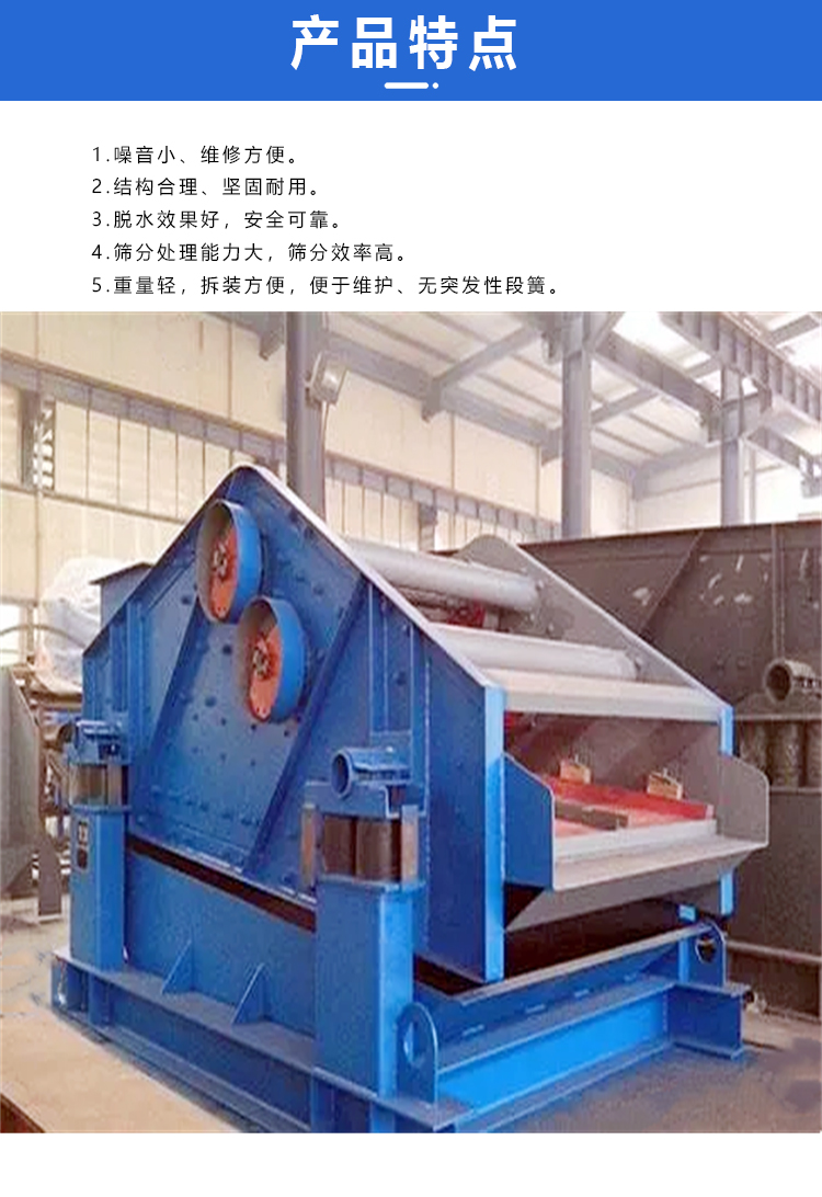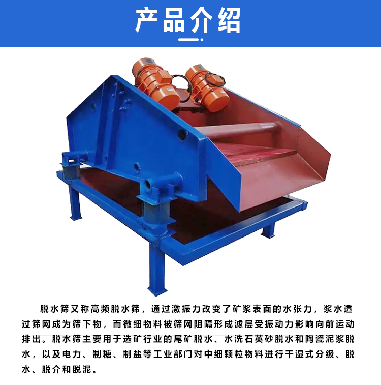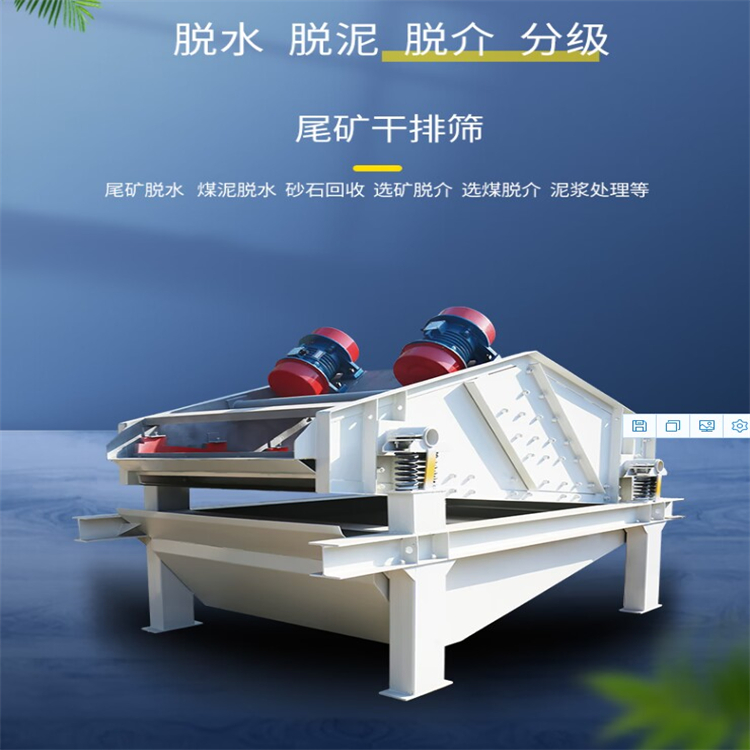 湿砂浆细筛脱水筛煤炭选煤选矿发电制糖制盐等工业部门对中细粒度物料进行干湿式筛分脱水脱介脱泥。化工、制砖、食品、制药、制碱、化肥、造纸等行业中各种物料的干法、湿法筛分、分级、脱水。用于选矿厂磨矿分级流程中的细粒分级作业