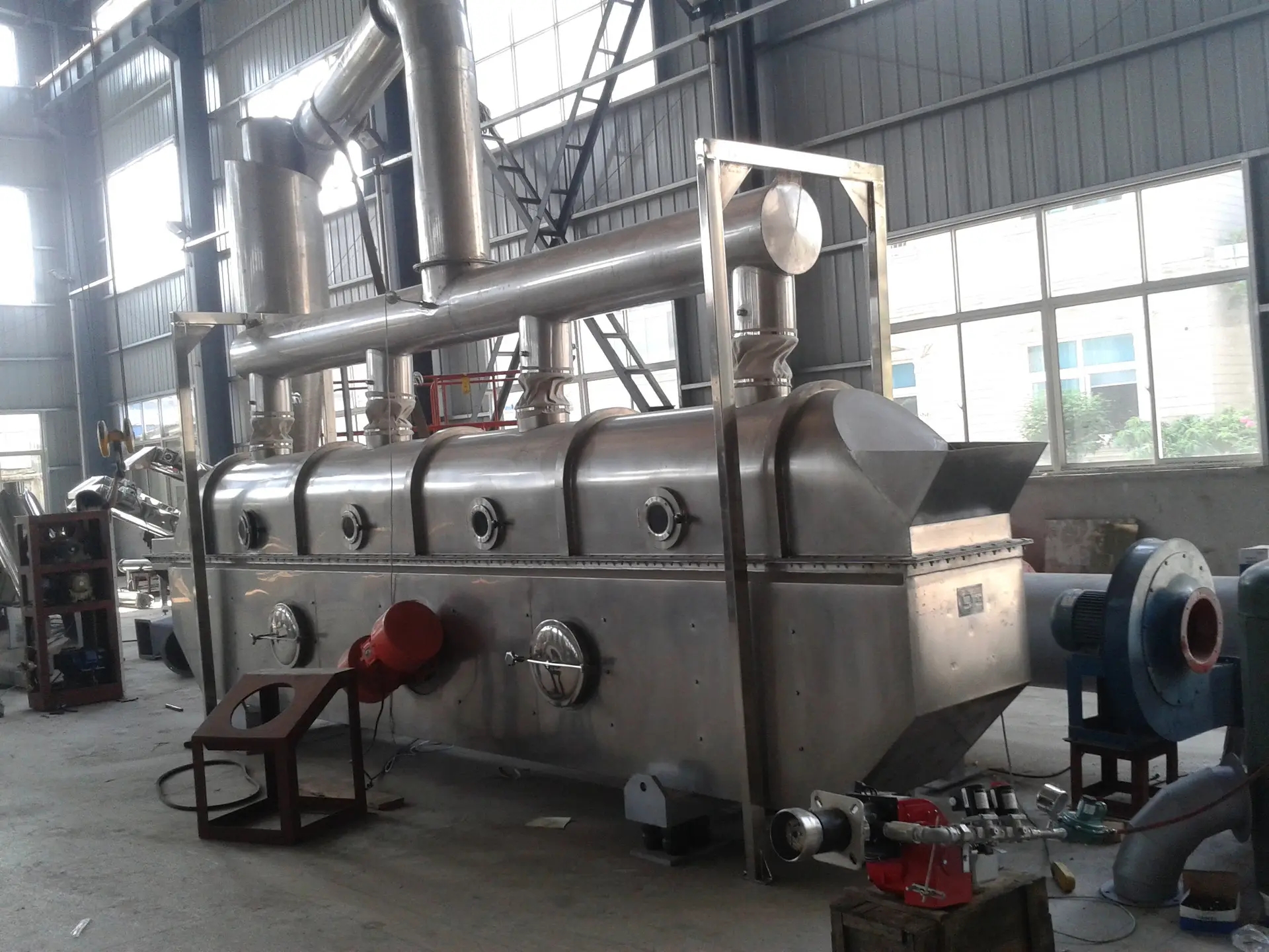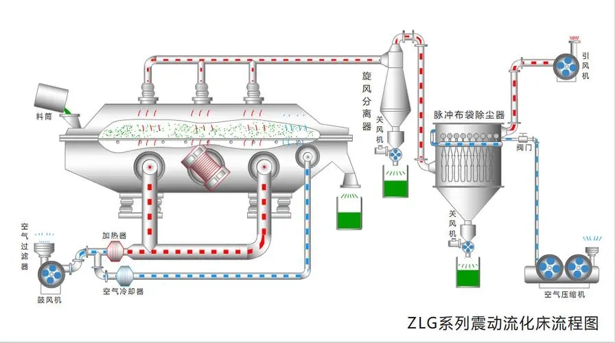 进料进口进入,在振动力作用下,物料沿水平面流化床抛掷