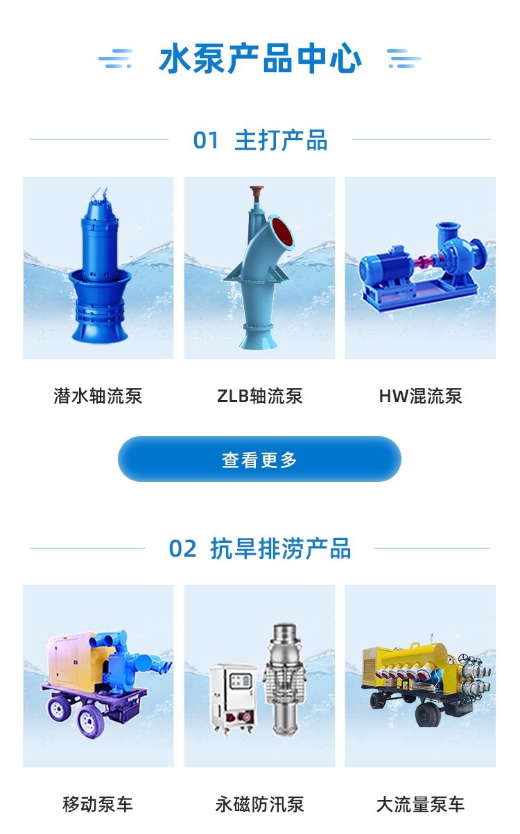 适用环境 | 潜水轴流泵适用于多种环境,如江河水系取水、湖泊取水、矿坑取水、水库调水、河流调水、海水提升、污水排放、雨季防汛等多种环境 |