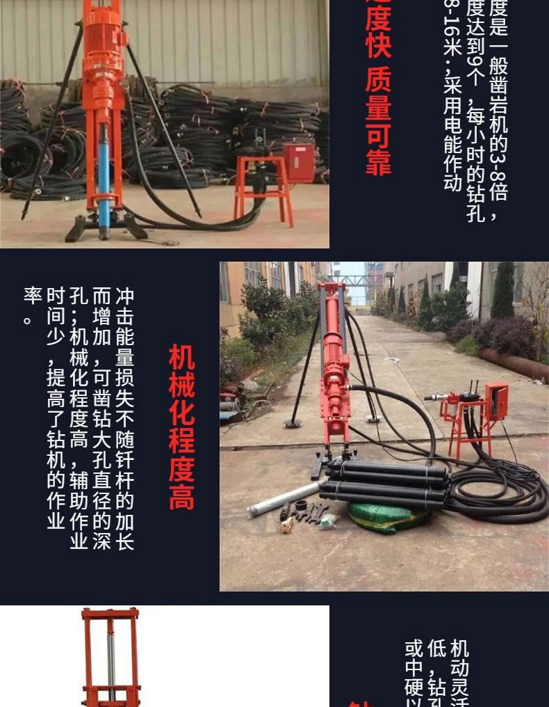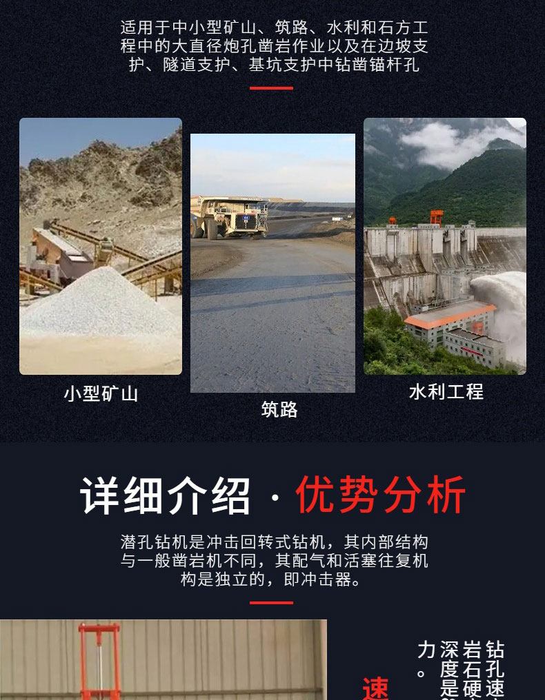 潜孔钻机产品介绍潜水工程钻机为潜水式电动回转钻机,是钻孔灌注桩的理想成孔机械。亦可将数能钻机组合成群钻用于地下连续墙和竖井防渗帏幕等工程施工。适用于淤泥、粘土、砂砾层、风化页岩等多种地层钻孔。广泛应用于工民建、交通、水利、电力、港口等工程的基础施工。潜孔钻机适用范围潜孔钻机主要供露天矿山钻,也可以用于建筑、水利电力工程、公路铁路及军事工程等进行露天钻孔作业。是中小型露天矿山的主要穿孔设备之一。潜孔钻机在海拔高度3000m以下,温度为-35℃至40℃气候条件下均可使用。通常在12-15m的台阶上钻60°、75°、90°范围内的200mm孔径的倾斜或垂直炮孔。潜孔钻机性能特点钻机自带有螺杆风冷式空气压缩机和315KVA电力变压器。宽敞明亮、并采用增压净化技术的司机室,为操作者提供舒适的工作环境。钻具的推进、调压采用气、电联合自动推进。钻机备有干式和湿式两种除尘系统,供用户选择。备有装卸冲击器的悬臂吊,供维修用的电焊机以及钻具打捞工具。
