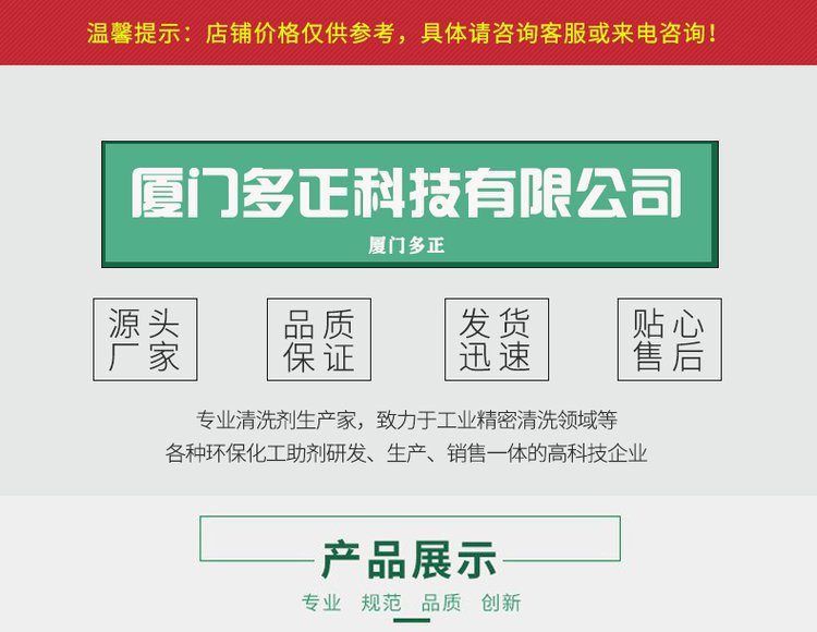 厦门多正科技有限公司是一家专业致力于工业精密清洗领域等各种化工助剂研发、生产、销售一体的高科技企业。多年来坚持以人为本,积极与各大知名院校合作,积极引进国外先进技术与配方,开发出一系列适合现代化加工、精密、经济要求,可以替代对环境和人类危害极大的传统工艺的产品。我们目前已为国内多家知名企业提供服务与配套方案。