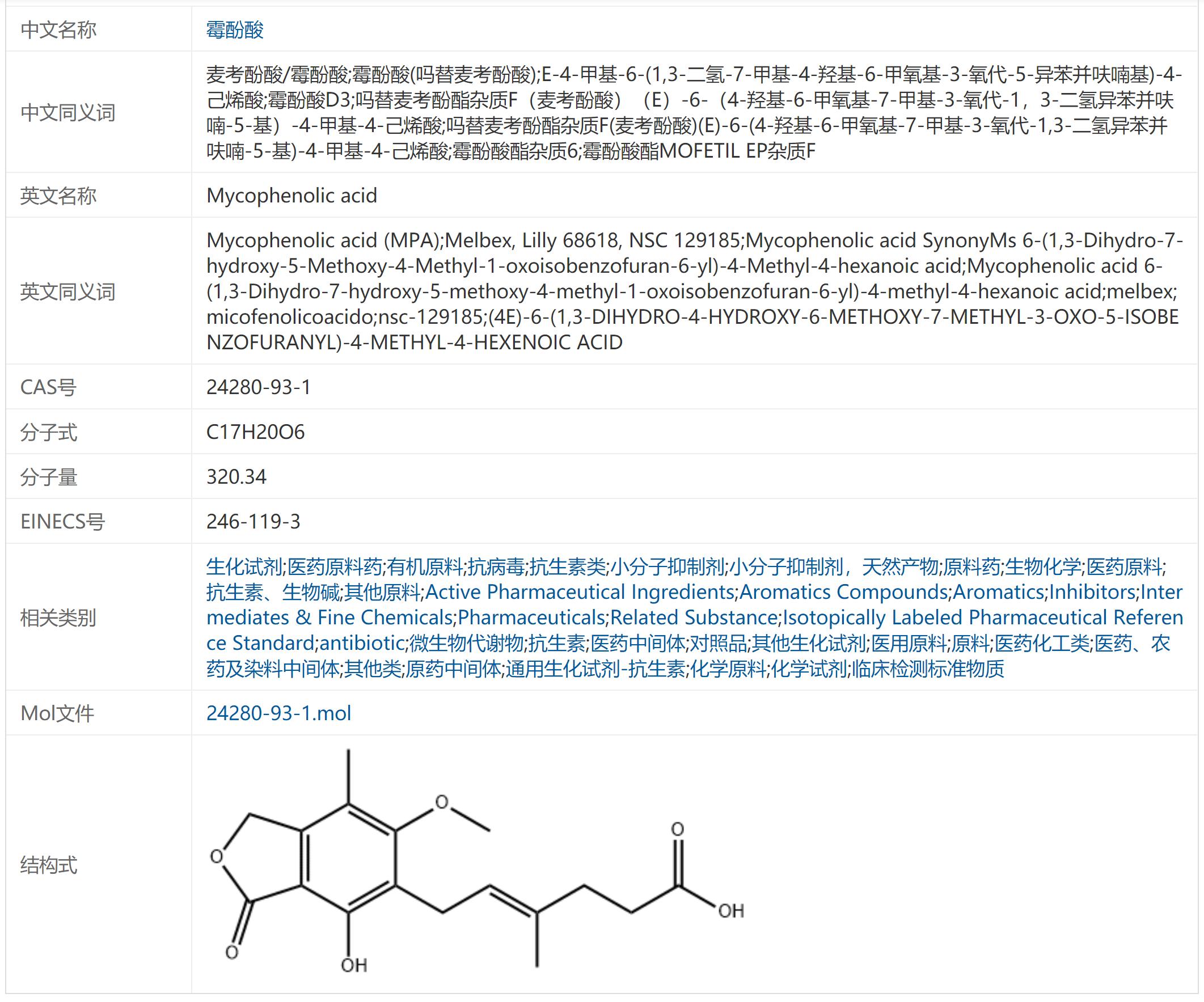 霉酚酸/麦考酚酸 24280-93-1磷酸脱氢酶 生化试剂 匠信生物