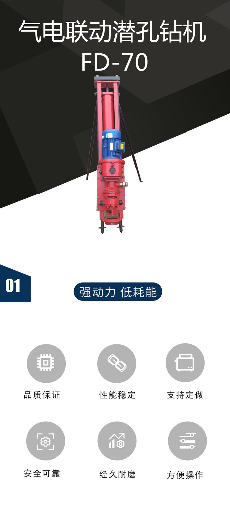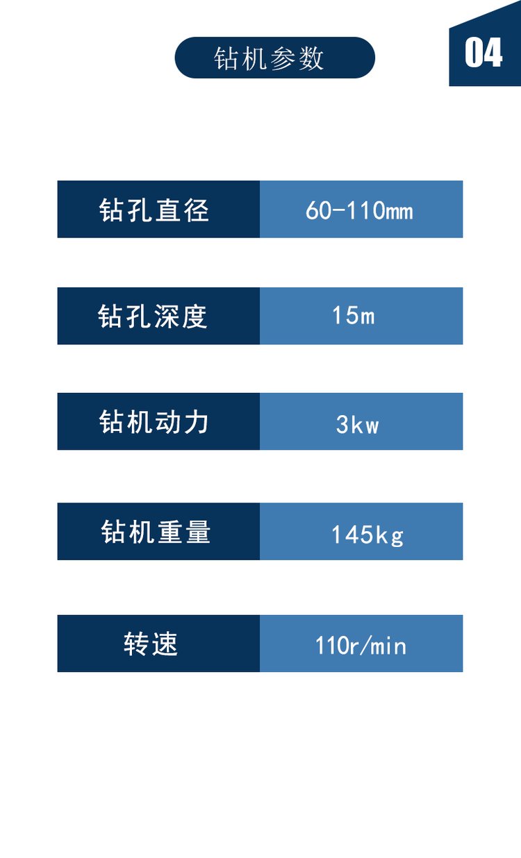 潜孔钻机产品介绍潜水工程钻机为潜水式电动回转钻机,是钻孔灌注桩的理想成孔机械。亦可将数能钻机组合成群钻用于地下连续墙和竖井防渗帏幕等工程施工。适用于淤泥、粘土、砂砾层、风化页岩等多种地层钻孔。广泛应用于工民建、交通、水利、电力、港口等工程的基础施工。潜孔钻机适用范围潜孔钻机主要供露天矿山钻,也可以用于建筑、水利电力工程、公路铁路及军事工程等进行露天钻孔作业。是中小型露天矿山的主要穿孔设备之一。潜孔钻机在海拔高度3000m以下,温度为-35℃至40℃气候条件下均可使用。通常在12-15m的台阶上钻60°、75°、90°范围内的200mm孔径的倾斜或垂直炮孔。潜孔钻机性能特点钻机自带有螺杆风冷式空气压缩机和315KVA电力变压器。宽敞明亮、并采用增压净化技术的司机室,为操作者提供舒适的工作环境。钻具的推进、调压采用气、电联合自动推进。钻机备有干式和湿式两种除尘系统,供用户选择。备有装卸冲击器的悬臂吊,供维修用的电焊机以及钻具打捞