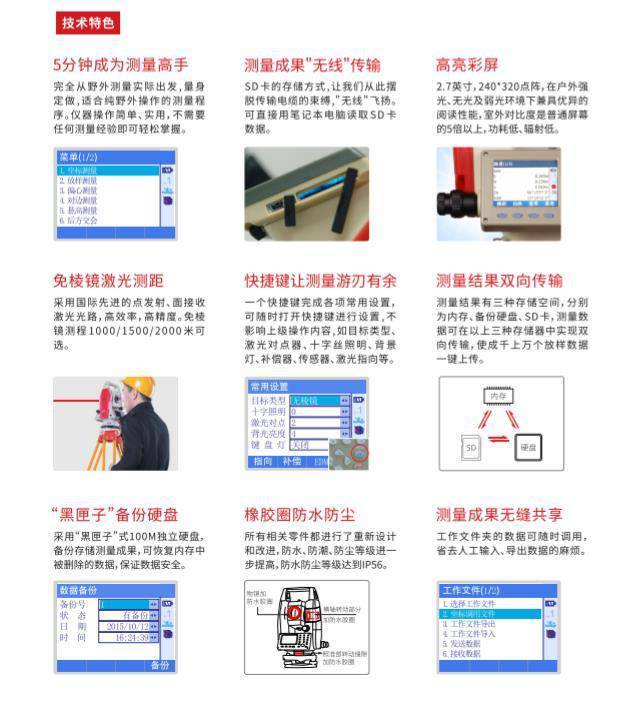 KTS-462R8L彩屏全站仪,全彩高亮显示器,操作更直观简便,免棱镜测程可达到800米。此外,带SD存储卡、激光对中、激光指向等功能。