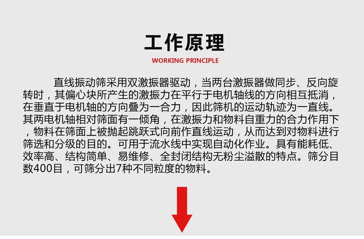 3、偏振筛是一种偏心振动筛,它在高速转动过程中由于偏心传动轴产生振动,所以称之为偏心筛。其偏心轴直接带动筛框在垂直面上作幅度为2倍偏心距离的轨迹运动。