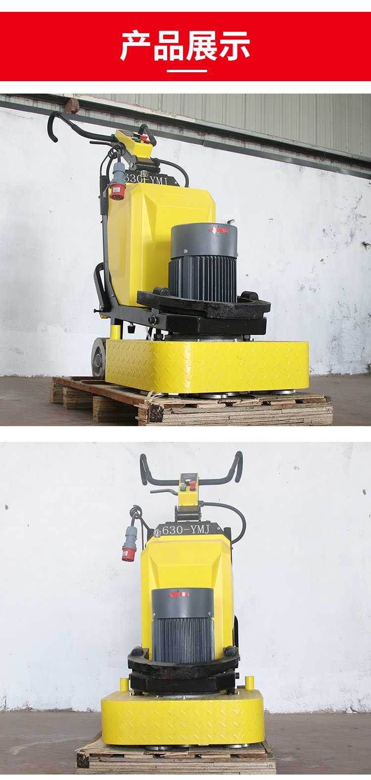 型号model JS630 电机motor 10HP 电压power source 380v 电流 current 16amps 转速 motor rpm 0-1800rpm 重量weight 270kg 磨片数No.of grinding pads 12 磨盘 grinding heads 4