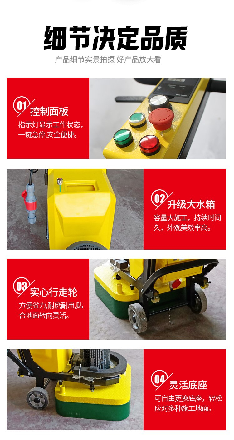 2.该机配备不同粗细的金刚石刀具,可实现各类地坪的研磨[如硬化耐磨、水磨石、金刚砂地面,各类混凝土基层表面,研磨修整拉毛处理]. 另可对薄层油漆、进行研磨去除处理.