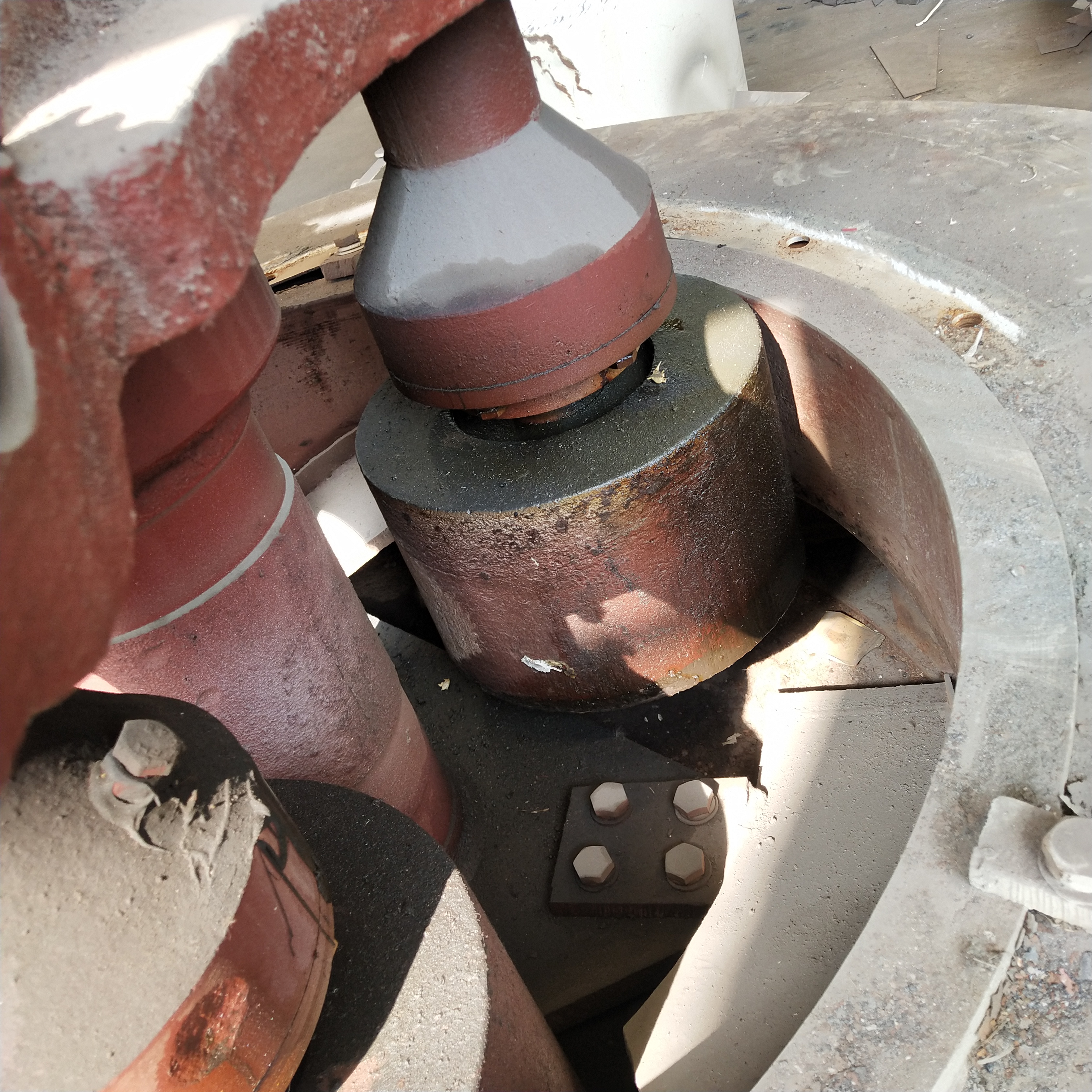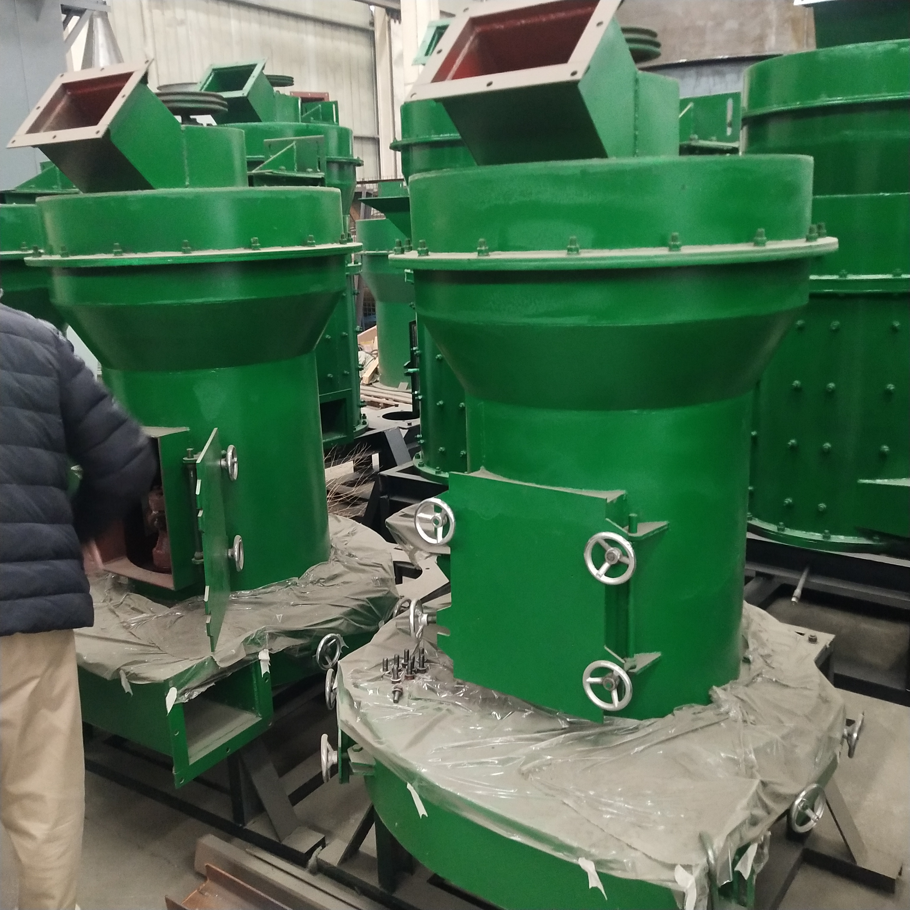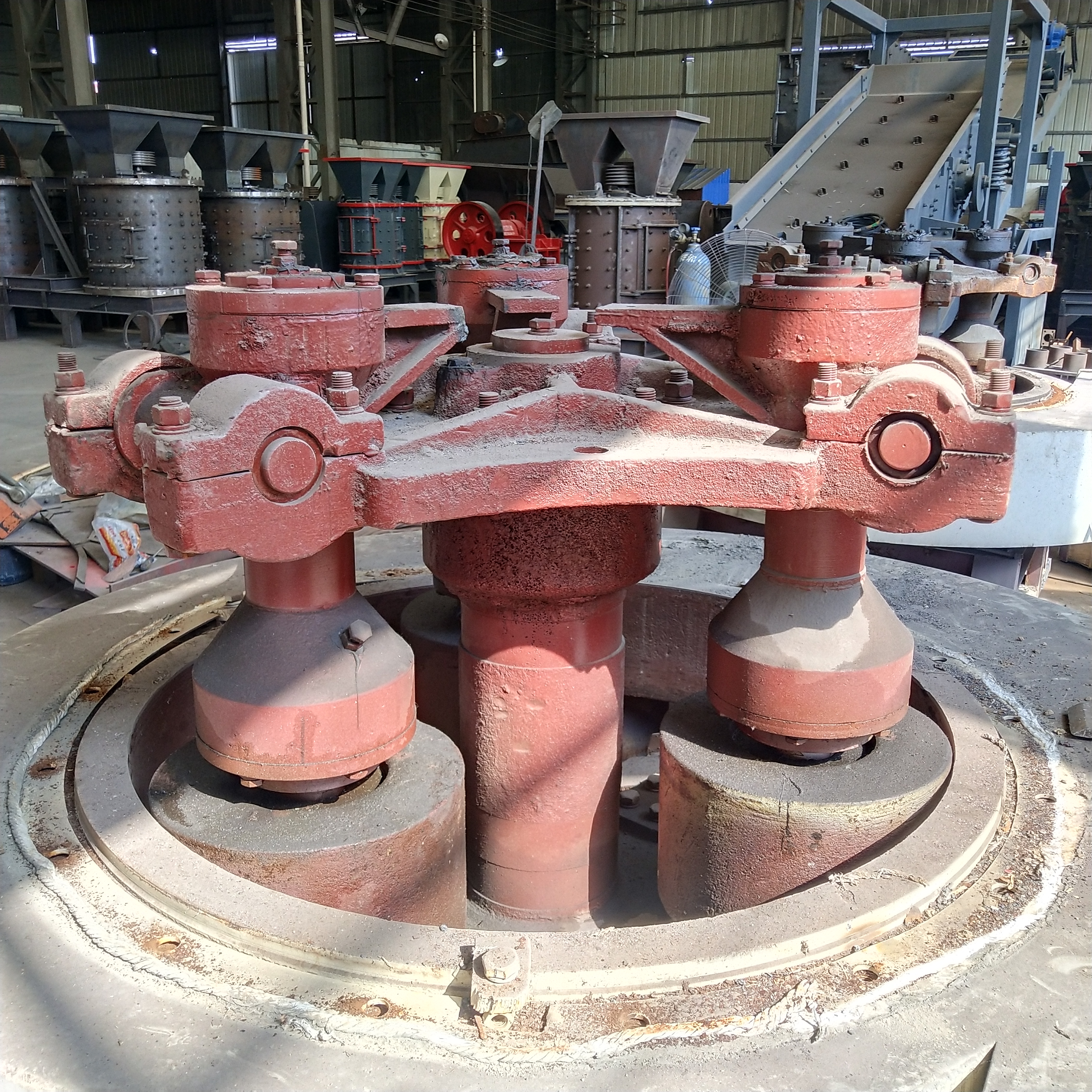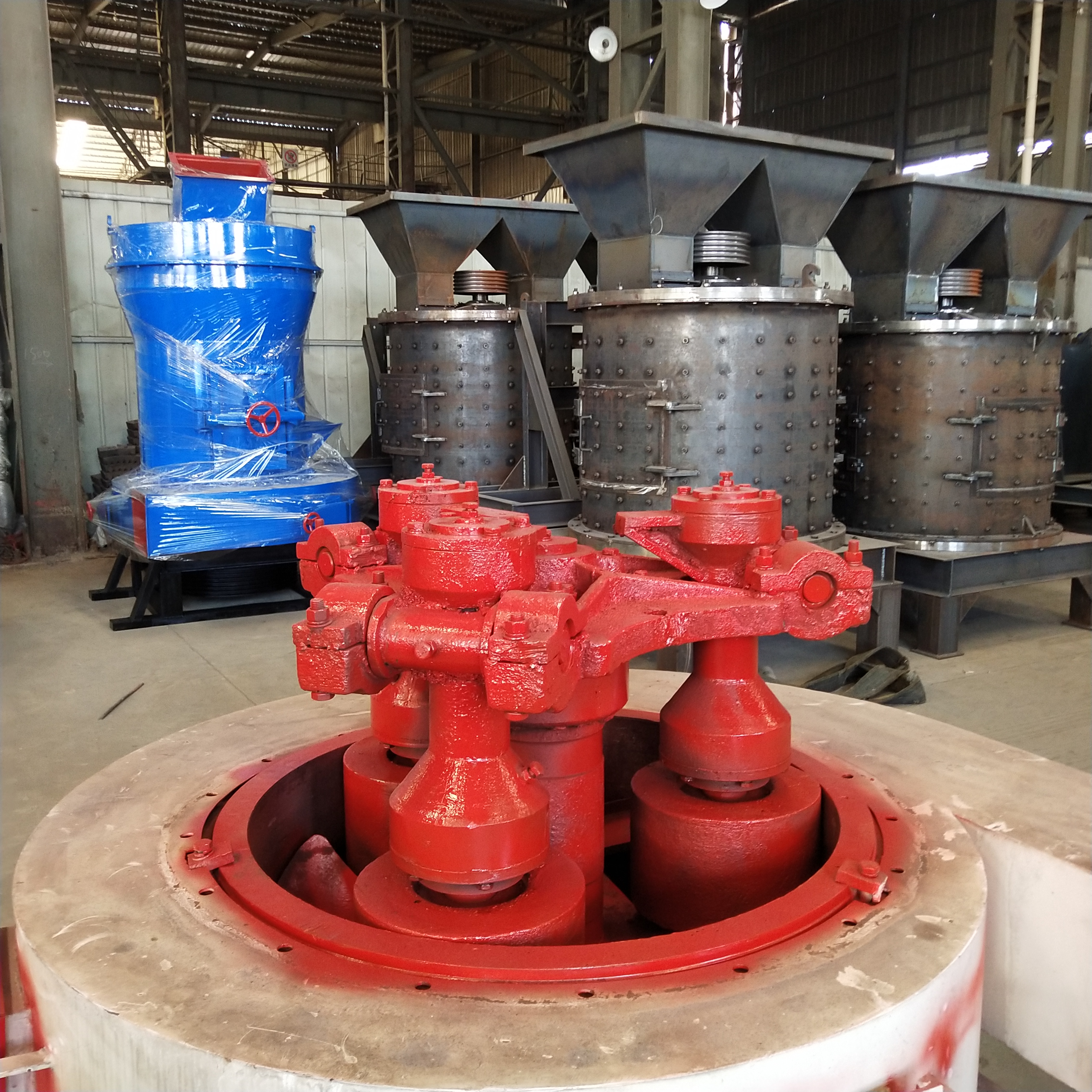 雷蒙磨粉机的磨辊轴安装在梅花架上,梅花架由传动装置带动而快速旋转,磨环是固定不动的,物料由机体侧部通过给料机进入机体内部,在磨辊和磨环之间受到磨矿作用。气流从磨环下部以切线方向吹入,经过磨辊同圆盘之间的磨区,夹杂粉尘排入盘磨机上部的风力分级机。梅花架上悬有3-6个磨辊,绕机体中心轴线公转。由于公转产生的离心力,磨辊向外张开,压紧磨环并在其上面滚动。给入磨机内的物料由铲刀铲起并送入磨辊与磨环之间进行磨。铲刀与梅花架连在一起,铲刀是倾斜安装的,每个磨辊前面有一把铲刀,使物料形成一股物料流连续送至磨辊与磨环之间。