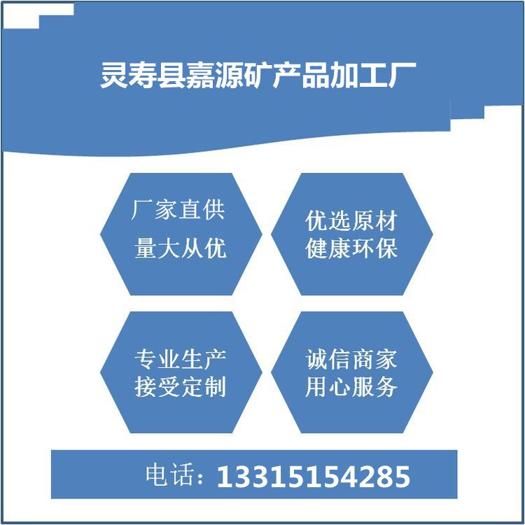 灵寿县嘉源矿产品加工厂是生产非金属矿物企业。始建于2000年,占地面积9000多平方米,主要产品是云母粉、脱水云母、白云石、硅线石、石英、白土子、木纤维、白泥、中锰、钾长石、脱水长石、大理石、漂珠、蛭石、石墨、纤维素、竹粉、硅锰、金红石、电焊条各种辅料等等等。年产各种规格云母粉10000吨,石英、蛭石制品5000吨,彩砂及鹅卵石制品5000吨。