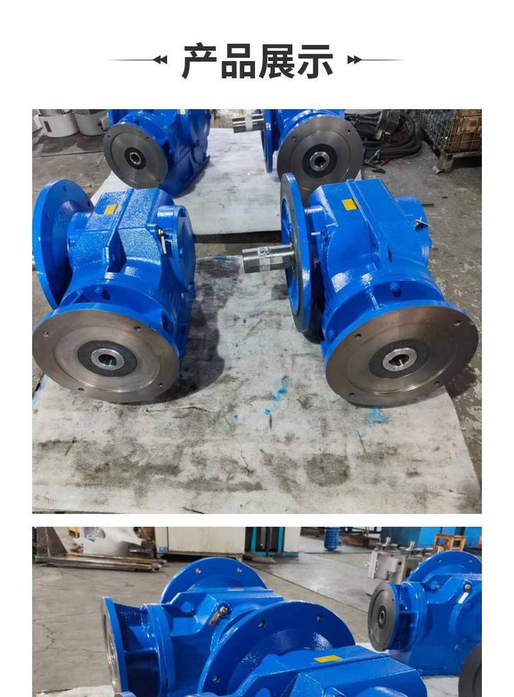 卧式底座式安装,平面法兰安装,齿轮减速比范围:R基本型3.33~289.74,RX型1.3~8.65,R/R组合型可达到27001。