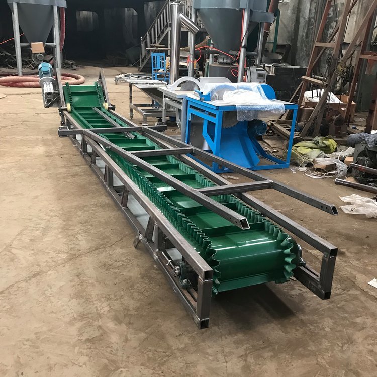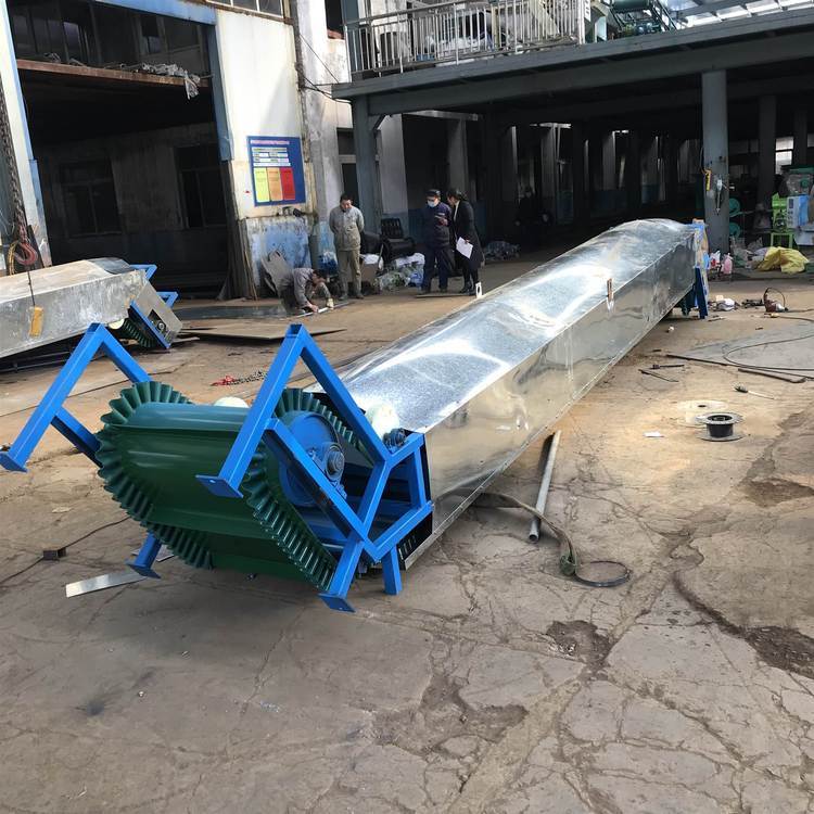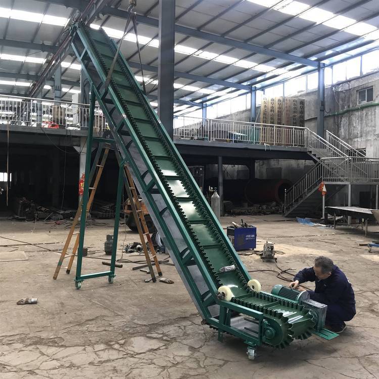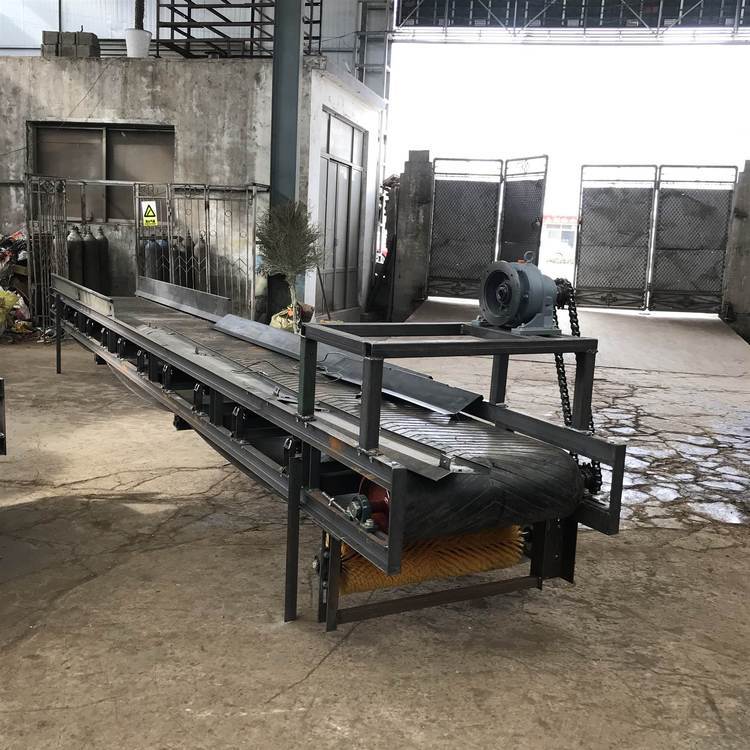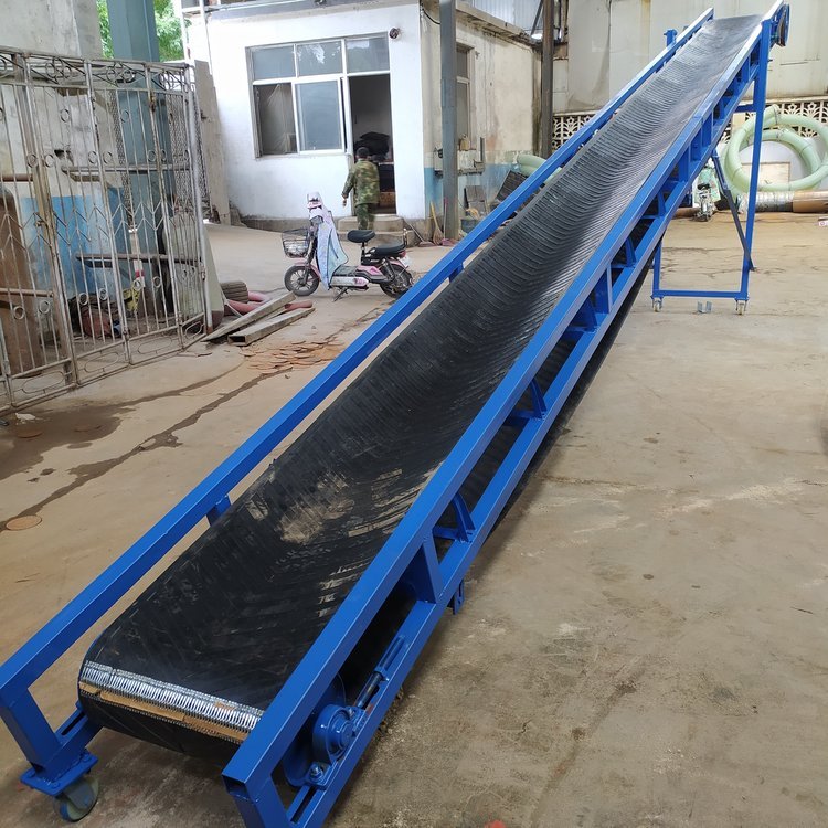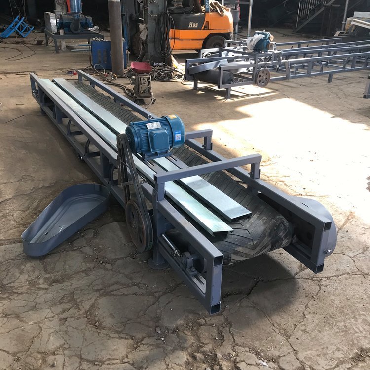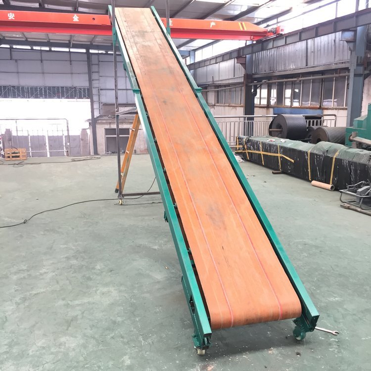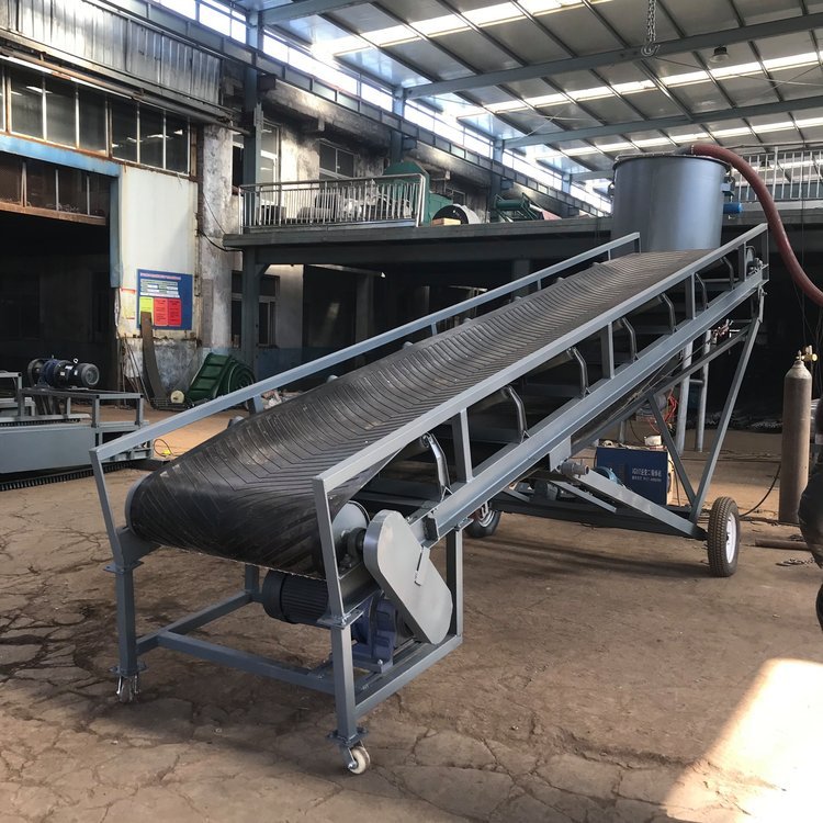 胶带输送机又称皮带输送机,输送带根据摩擦传动原理而运动,适用于输送堆积密度小于1.67/吨/立方米,易于掏取的粉状、粒状、小块状的低磨琢性物料及袋装物料,如煤、石、砂、水泥、化肥、粮食等。胶带输送机可在环境温度-20℃至+40℃范围内使用,被送物料温度小于60℃。其机长及装配形式可根据用户要求确定,传动可用电滚筒,也可用带驱动架的驱动装置是组成有节奏的流水作业线不可缺少的经济型物流输送设备。皮带机按其输送能力可分为重型皮带机如矿用皮带输送机。按其支架结构有固定式和移动式两种皮带输送机;按输送方式有普通连续运行、节拍运行、变速运行等多种控制方式;线体因地制宜选用:直线、弯道、斜坡等线体形式。连续或间歇输送100KG以下的物品或粉状、颗状物品;运行高速、平稳,噪音低,可用于上下坡传送;上坡输送等特性。可广泛应用在冶金、矿山、煤炭、港口、交通、水电、化工等部门,进行装车、装船、转载或堆积各种常温状态的松散密度为500~2500kg/m3各种散状物料或成件物品.由单机或多机组合成运输系统来输送物料,根据工艺要求可布置成水平或倾斜的形式 除了可满足水平或倾斜输送要求外,还可采用带凸弧段、凹弧段与直线段组合的输送形式.输送机允许输送的物料块度取决于带宽、带速、槽角和倾角,也取决于大块物料出现的频率移动式皮带输送机,胶带主要有宽度500、600、650、800mm,1000、1200、1500等特殊规格可以另行设计,皮带输送机是一种连续输送散状物料或成件物品的运输设备,具有结构紧凑,工作性能可靠、输送量大、生产效率高、操作灵便等优点,广泛运用于港口、码头、车站、仓库、料场、厂矿等地输送煤炭、砂石、粮食、化工原料、成件物品等。输送机配有行走轮,可作整机移动,输送倾角可以根据实际需要调整,倾角为22度,变幅机构可以手动调整,也可以采用电动执行;根据输送工艺布置要求,可以单机或多台组成水平或倾斜的输送系统。可根据用户需要而设计制造特殊型号规格尺寸及材质的输送机。
