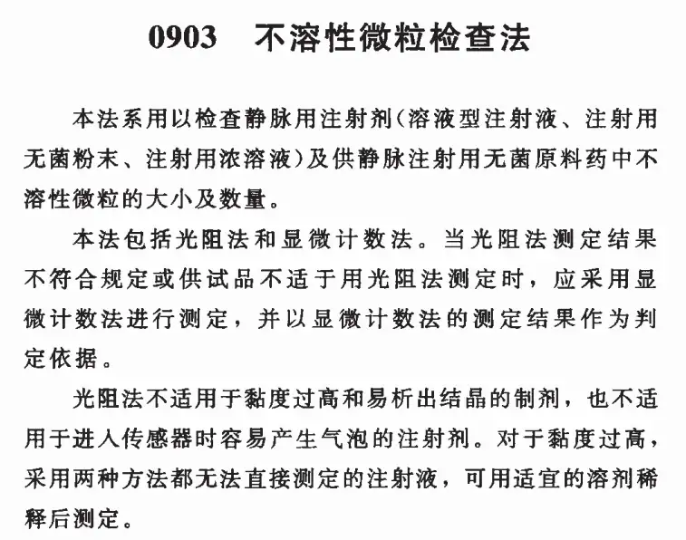 中国药典2020版0903不溶性微粒检查法包括光阻法和显微计数法两种方法。光阻法的测定原理是通过微粒对光的阻挡被传感器进行接收而判定微粒的大小及数量,因此光阻法不适用于黏度过高和易析出结晶的制剂,也不适用于进入传感器时容易产生气泡的注射剂。当光阻法测定结果不符合规定或供试品不适合用光阻法测定时,应采用显微计数法进行测定,并以显微计数法的测定结果作为判定依据。