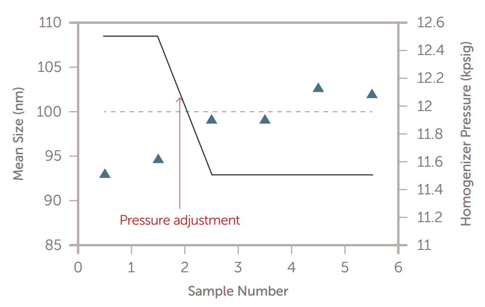 第二个实验的初始尺寸读数低于目标尺寸约 5–7 nm,因此进行了压力调整(降低 1,000 psig)。在稍后的时间点,平均粒径按预期增加了 ~5–10 nm。