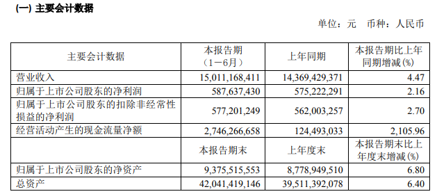 报告期内公司实现营业收入 150 亿元,较上年同期增加 4%,实现利润总额 9.25 亿元,较上年同期下降 7%,实现净利润 7.52 亿元,较上年同期增加 1%,其中归属于母公司股东的净利润5.88 亿元,较上年同期增加 2%。
