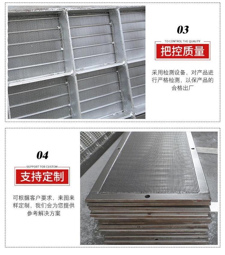 特点:不锈钢熔接式筛网是由支撑条和筛条两部分构成。支撑条可以是圆丝也可以是三角形丝或梯形丝,筛条是三角形丝(v型丝),缝隙尺寸精,过滤精度高;具有结构坚固,耐高温,耐腐蚀,机械性能好,使用寿命长,安全可靠等特点。可用于多种介质的过滤和筛选。
