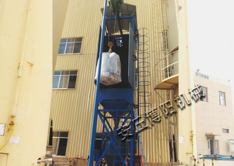 吨袋拆包机与电动葫芦相连,吨装用电动葫芦提升到卸料口上,人工解开吨装袋下的卸料口,打开光圈阀,吨装袋内的物料靠自身重力落入储料斗,可以通过振打器促使下料,此操作简单、便捷。应用于塑料及塑料添加剂、混合剂、污水处理澄清剂、水泥等干燥的粉沫、颗粒物料、粉粒混合物、片状物料的拆包场合。