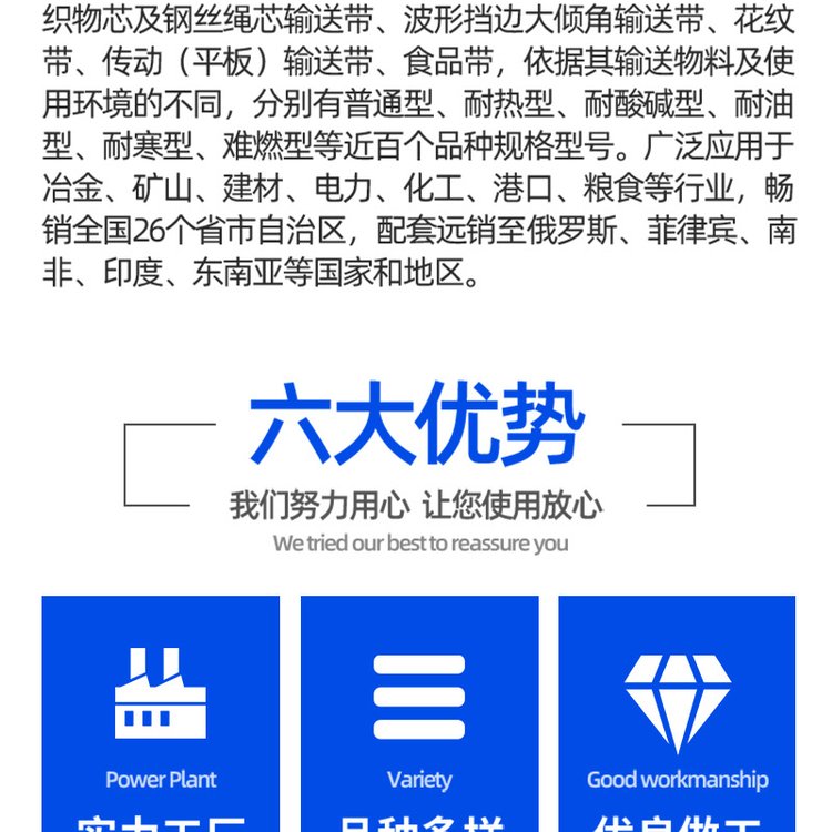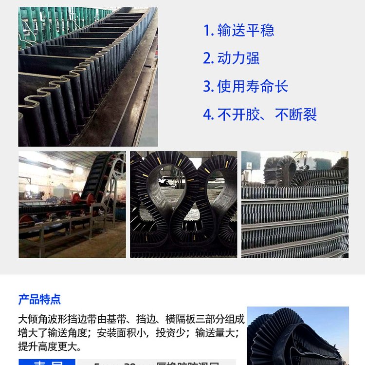 输送带、输送机、耐热输送带、尼龙输送带、阻燃输送带、钢丝绳输送带、托辊、滚筒、支架、大倾角输送带、耐酸碱输送带、环形裙边带、输送机配件、帆布输送带