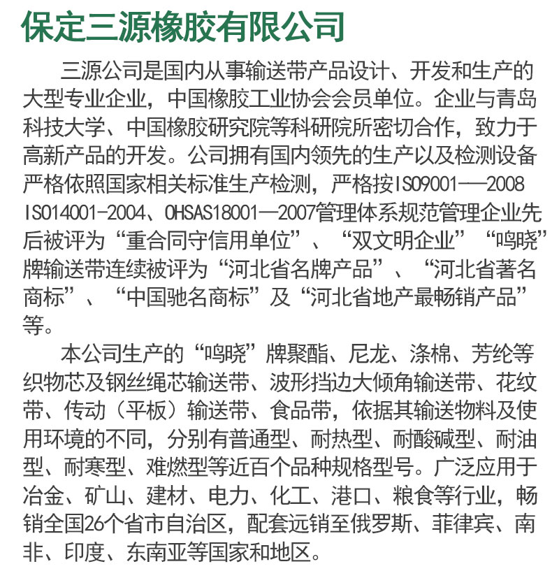输送带、输送机、耐热输送带、尼龙输送带、阻燃输送带、钢丝绳输送带、托辊、滚筒、支架、大倾角输送带、耐酸碱输送带、环形裙边带、输送机配件、帆布输送带