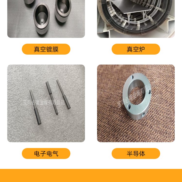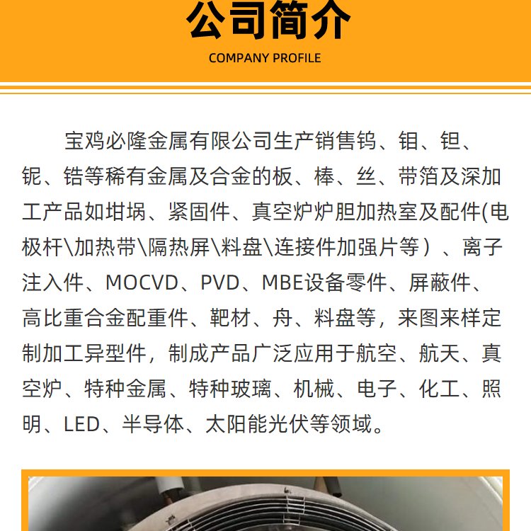 钨钼钽铌锆、离子注入件、真空炉加热室、坩埚、加热带、隔热屏、螺丝螺母、紧固件、钼电极杆、加工件、钨钼异型件、炉胆配件、颗粒、钨绞丝、靶材、钨舟、镍带、钼镧合金、钨铜合金、钨镍铁、钨镍铜、高比重合金