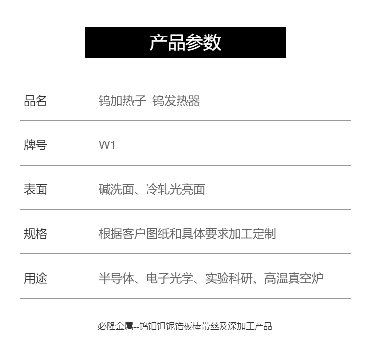 钨钼钽铌锆、离子注入件、真空炉加热室、坩埚、加热带、隔热屏、螺丝螺母、紧固件、钼电极杆、加工件、钨钼异型件、炉胆配件、颗粒、钨绞丝、靶材、钨舟、镍带、钼镧合金、钨铜合金、钨镍铁、钨镍铜、高比重合金