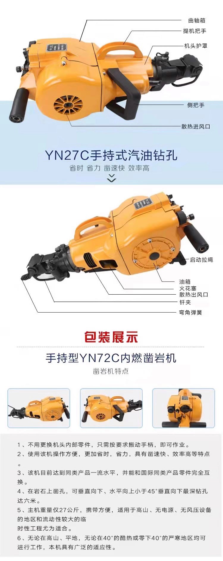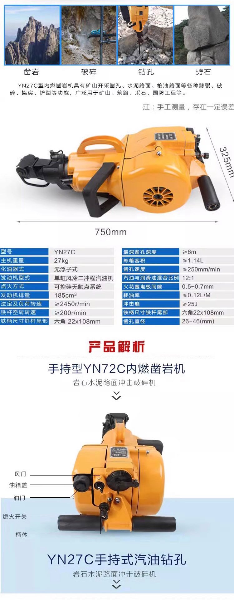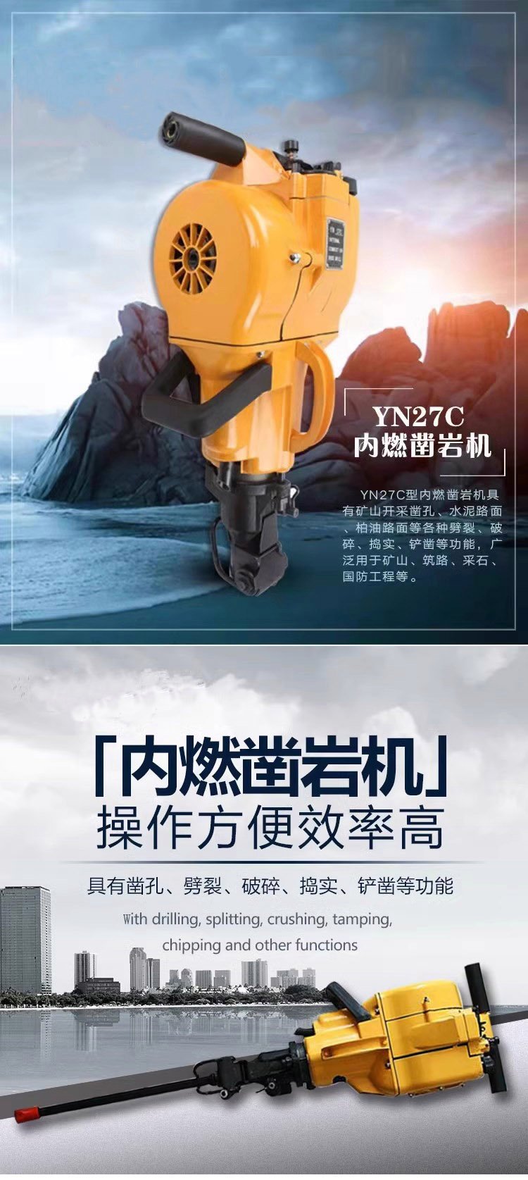 手持式内燃凿岩机YN-27C混凝土水泥岩石钻孔机汽油钻孔破机