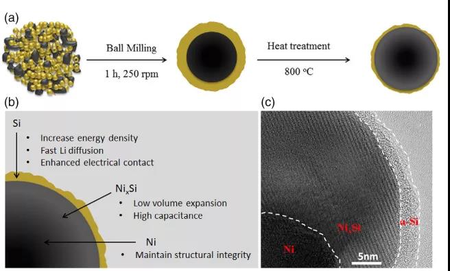 首先使用高能球磨研磨Ni和纳米硅颗粒1小时,产生Ni– Si核壳结构。然后,预活化的核-壳纳米结构在惰性Ar气氛中在 800 C下退火4小时,使硅化镍在Si-Ni界面之间生长。在硅化物形成过程中,镍原子通过镍/硅化物界面向外扩散,而硅原子通过硅化物/硅界面向内扩散。