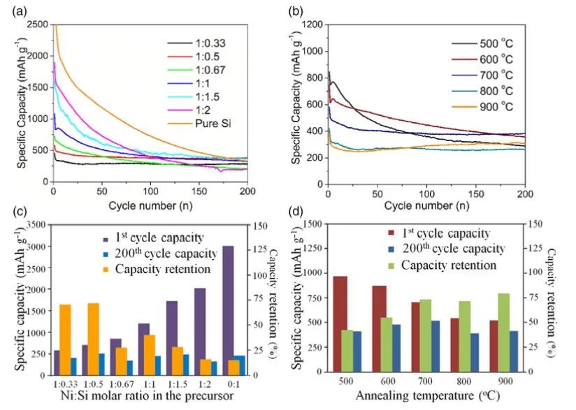 Si@NixSi/Ni 核的组成和形态-壳结构受退火温度和前体样品摩尔比的显着影响。样品的容量保持率随着 Si 摩尔比的增加而急剧下降。 Ni/Si 摩尔比为 1:0.5 的电极表现出最佳性能,具有合理更高的比容量和出色的稳定性。与原始 Si 电极相比,Si@NixSi/Ni 核壳电极表现出更好的循环性能。