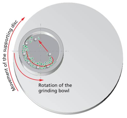 对其工作原理,我们可以通过下图的展示进行一个详细的描述:行星式球磨机都有一个主盘,也叫太阳盘,在主盘上有一个、两个或四个安放研磨碗的底座。当主盘转动时,研磨碗绕主盘轴公转的同时又围绕自身轴心自转,做行星式运动,且其自转方向与转盘转动方向相反。在行星式运动中,研磨碗和主盘旋转所形成的离心力作用在研磨碗内的研磨球和物料上,由于研磨碗和主盘旋转方向相反,所以,离心力在同向与反向间交替发挥作用,结果就是研磨球摩擦研磨碗一侧的内壁(摩擦力粉碎物料),当到达一定强度时,强力撞击另一侧内壁(撞击力粉碎物料),撞击力通过研磨球之间的相互碰撞使其作用增大。物料就是在此强力的冲击力和碾压下,得以粉碎、研磨、分散或混合。