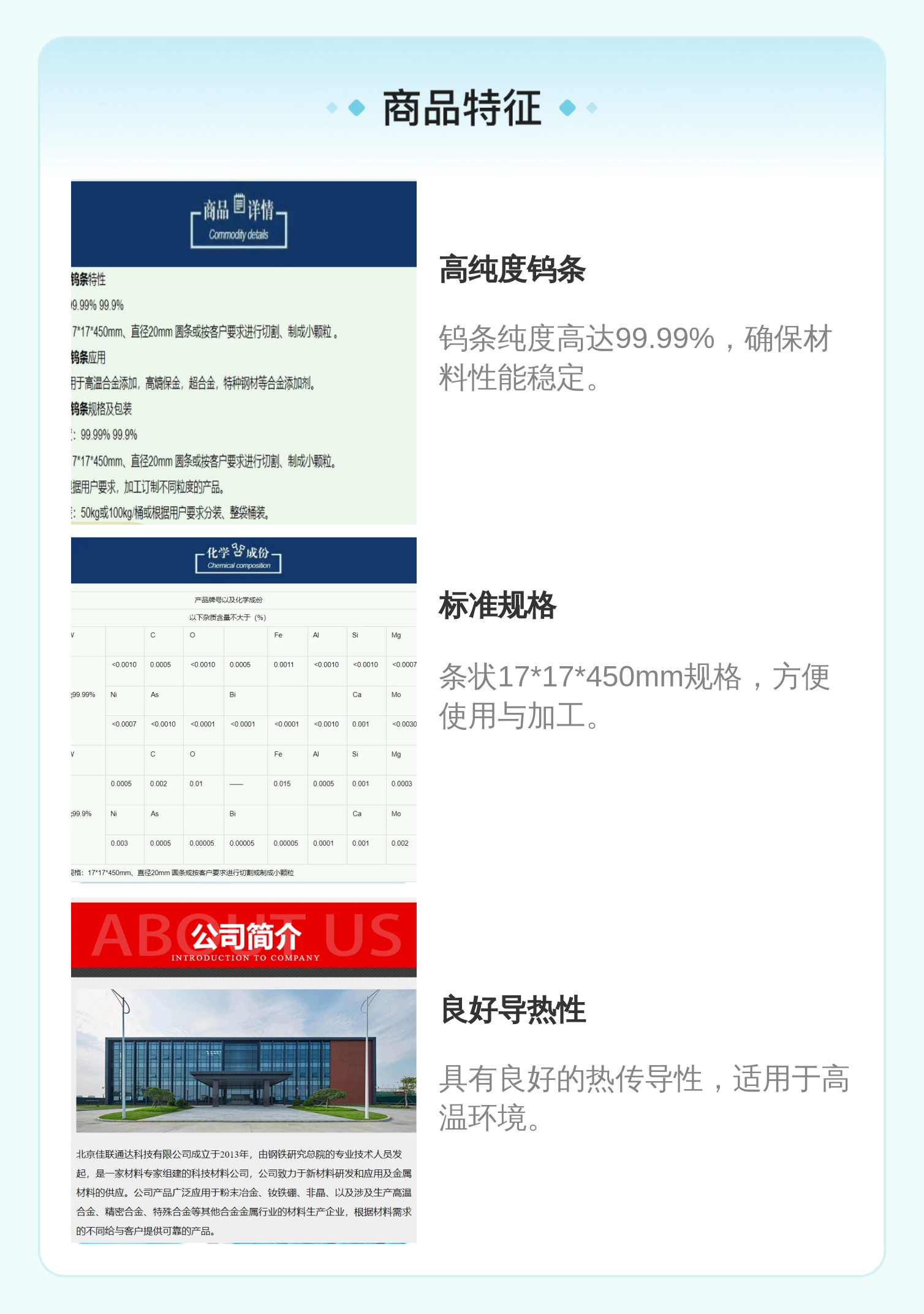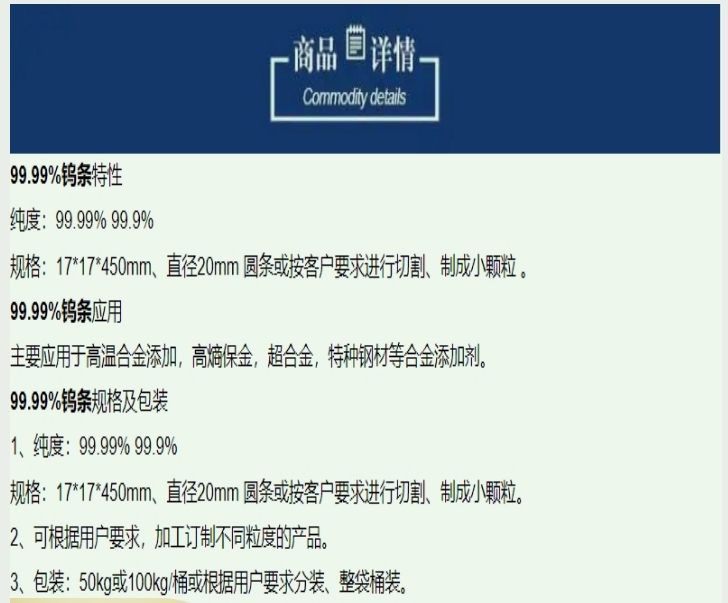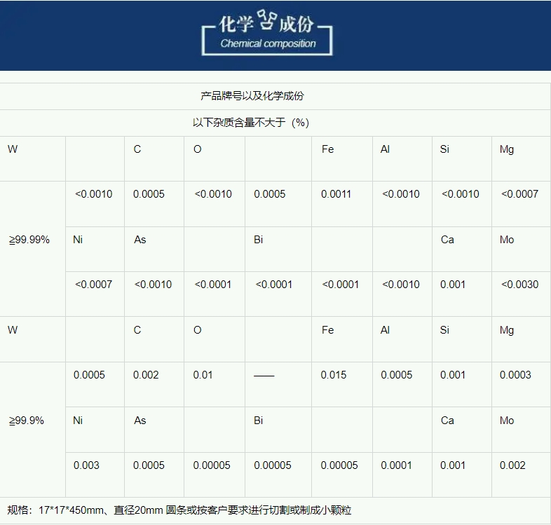 佳联通达牌W1钨条 99.99%高纯 条状17*17*450mm规格
