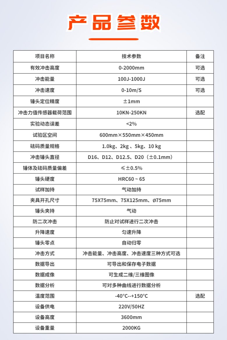 本试验机主要测试材料的抗冲击能力,即通过一定质量的锤头在一定的高度自由下落对试样进行冲击,通过高速率同步采集锤头对试样冲击接触后的数据,分析试样的抗冲击能力及试样的损坏和断裂状态。