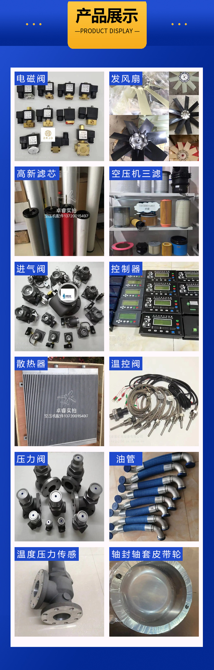 压缩机、散热风扇、进气软管、冷却风扇、轴流风机、板翅式冷却器、压力维持阀、油管、三滤、螺杆机专用油、干燥机、进气阀、温控阀、主机机头、电机、联轴器、PLC控制器