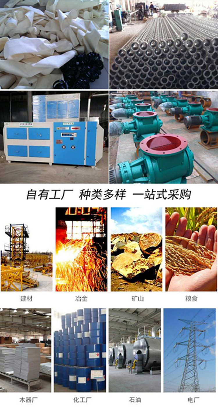 减振器、卸料器、吸气臂、雾化机、电磁阀、上料机、手动刀、翻板阀、调节阀、卸灰阀、减震垫、吸附箱、活性炭、锁风器、分料阀、控制器、安全阀、吸尘袋、喂料机、喷淋塔、针刺毡、排烟管、吸尘管、下料器、发电机